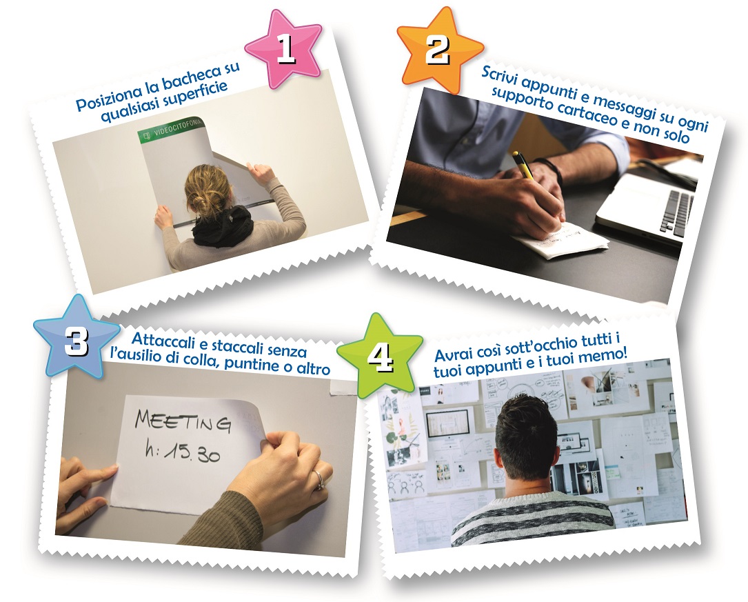 - Double Sticky Board. Lavagna memo di nuova generazione attacca e stacca su due lati, rimovibile e riutilizzabile. Autoadesiva, non è necessario fare buchi nel muro per appenderla e non danneggerà specchi, armadi una volta rimossa. Elementi come note, messaggi, immagini possono essere attaccati all’istante senza usare puntine o nastro adesivo. È semplicemente necessario “attaccare” e “staccare” più e più volte. Bastano solo pochi gesti per tenere d’occhio tutti i promemoria importanti.